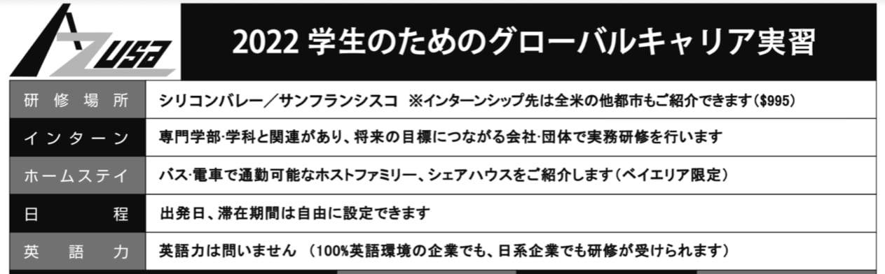 アメリカ現地の企業でインターンとして働き、お給料がもらえる。将来に確実につながるキャリア研修。研修先企業の紹介、ビザ申請手続き、現地での生活、帰国後の就職までトータルでサポートします。