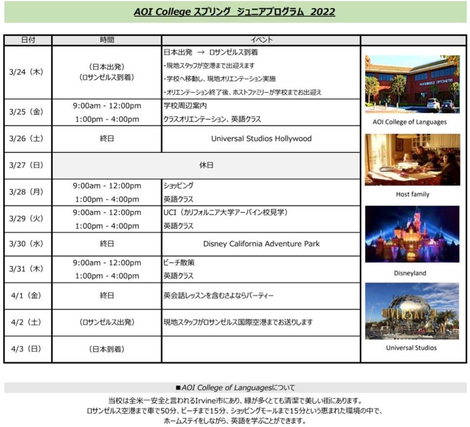 2022春休み中高生 アメリカ短期留学/ロサンゼルス近郊英語研修、ホームステイプログラム