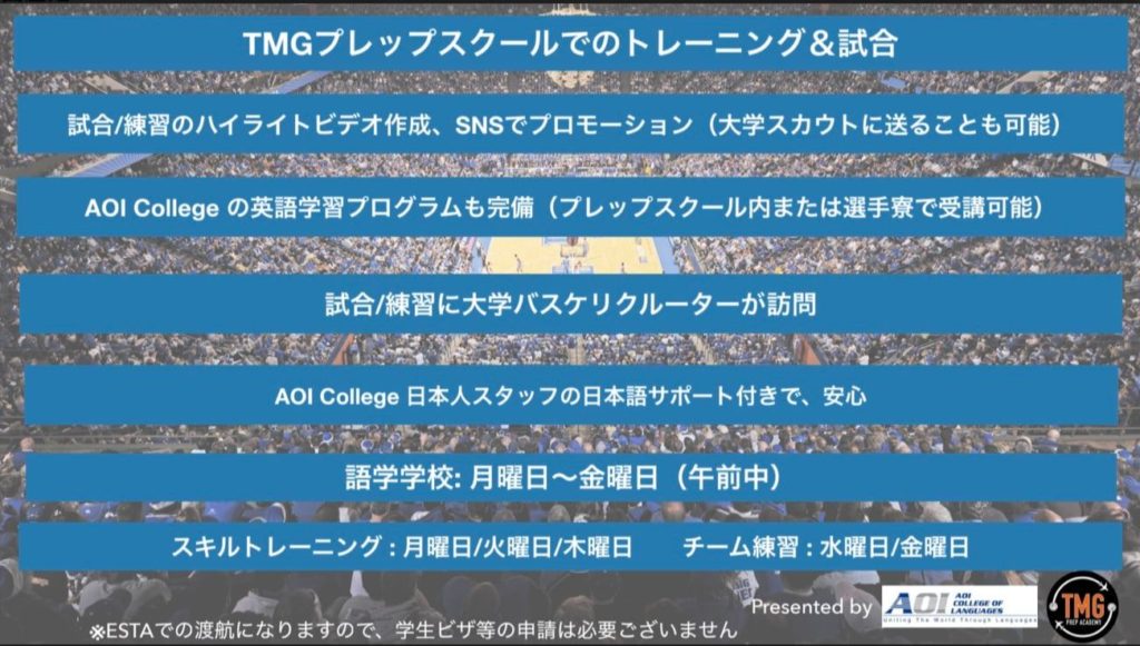TMG PREP ACADEMYは世界各国(アメリカ・フランス・イタリアなど)から選手が集まってくるバスケ専用プレップスクール兼チームで、