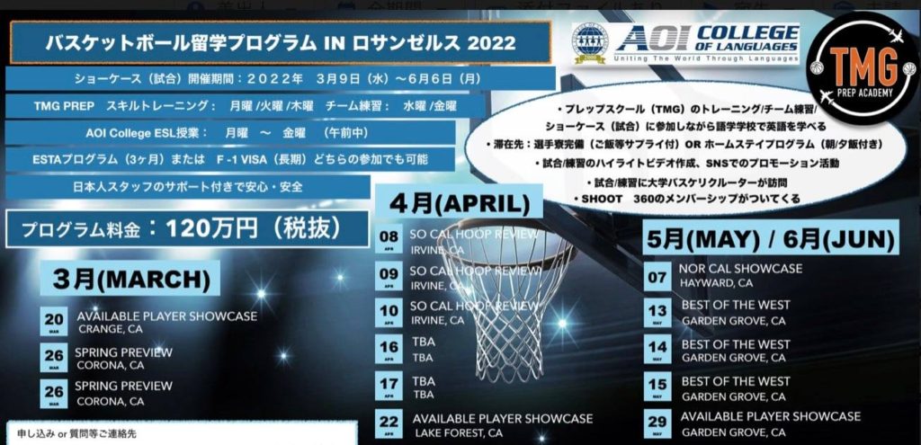 (今回のプログラム以外の期間でもバスケット留学がしたい選手を募集しております)