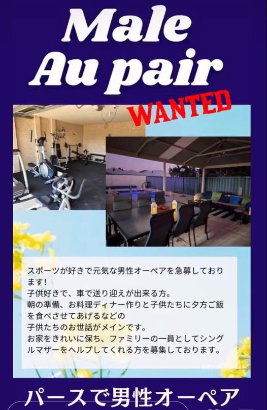 2022-06-30 / 最終更新日時 : 2022-07-04 wapj Au Pair/オペア募集情報 【オペア募集情報2207FA】オーストラリア、パースで男性オペア急募! オーストラリア、パースで男性オペア急募 オーストラリア、パースから男性オーペア急募の情報入ってきました。 男性のオーペア募集は普段なかなかないのでとても貴重です。 お問い合わせ/エントリー オペア渡航予定国 (必須) お名前 (必須) フリガナ (必須) メールアドレス (必須) 性別 (必須) 女性男性 国籍 (必須) 電話番号 (必須) 郵便番号 住所 (必須) 生年月日 (必須) 年齢 (必須) 最終学歴 (必須) 高校専門学校短大大学その他 最終卒業(予定)年月 (必須) 出発可能時期 (必須) 海外渡航歴(必須) ありなし パスポート(必須) ありなし 旅券番号 パスポートの有効期限(年月日) 履歴(必須) 高等学校卒業より最新の職歴・学歴までをご記入ください。 免許/資格(必須) 普通自動車第一種運転免許、TOEIC、TOEFL、英検など 渡航国の語学力(必須) 障なくコミュニケーションが可能日常会話には問題がないある程度の意思表示は可能まだ初歩的段階にある 趣味/特技(必須) 健康状態(必須) アレルギーや過去の疾病等ご記入下さい。 喫煙(必須) ありなし 保育経験(必須) チャイルドケア経験がある方は、子供の年齢、人数、お世話をした時間などの詳細をご記入ください。 二歳未満の保育経験(必須) ありなし 障害児の保育経験(必須) ありなし お世話ができる子供(必須) 当てはまるもの全て記入してください。 障害児3ヶ月〜12ヶ月児1〜2歳3〜5歳6〜7歳8〜10歳 お世話ができる子供の人数(必須) 1人2人3人以上 オペアプログラムへの参加/志望動機(必須) 渡航中の国内連絡先住所 (必須) 渡航中の国内連絡先氏名(必須) 渡航中の国内連絡先続柄(必須) 渡航中の国内連絡先電話番号(必須) ご予算(必須) ~30万円30~60万円60万円~100万円100万円~150万円150万円~200万円200万円以上 備考 Δ FacebookXBlueskyHatenaCopy