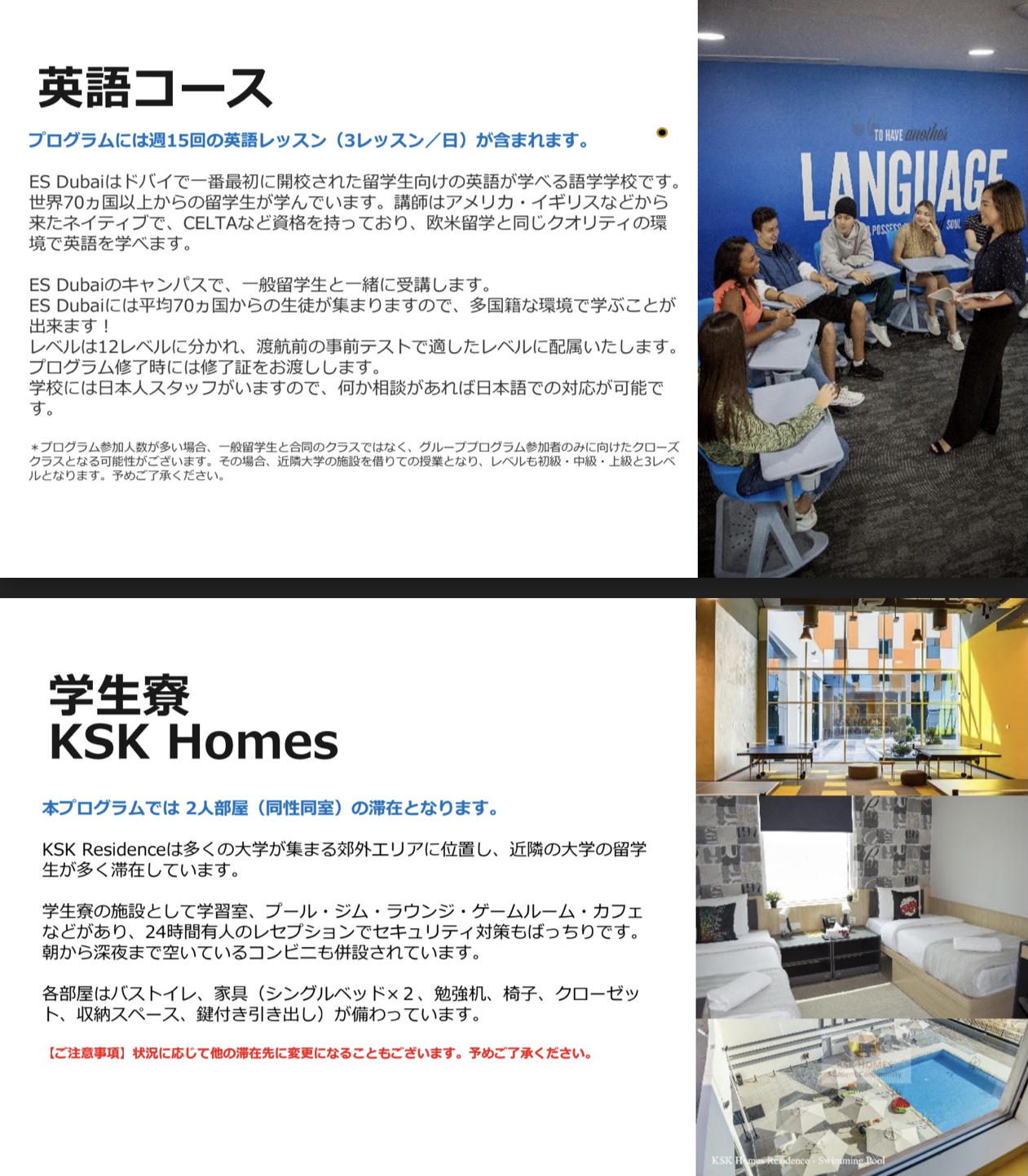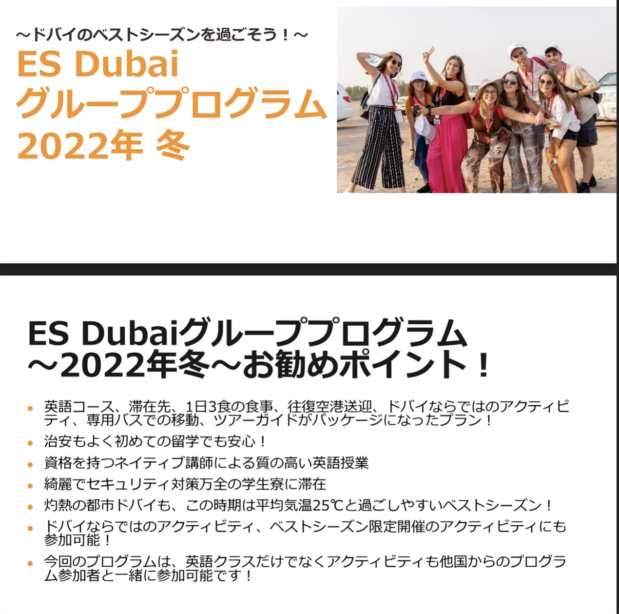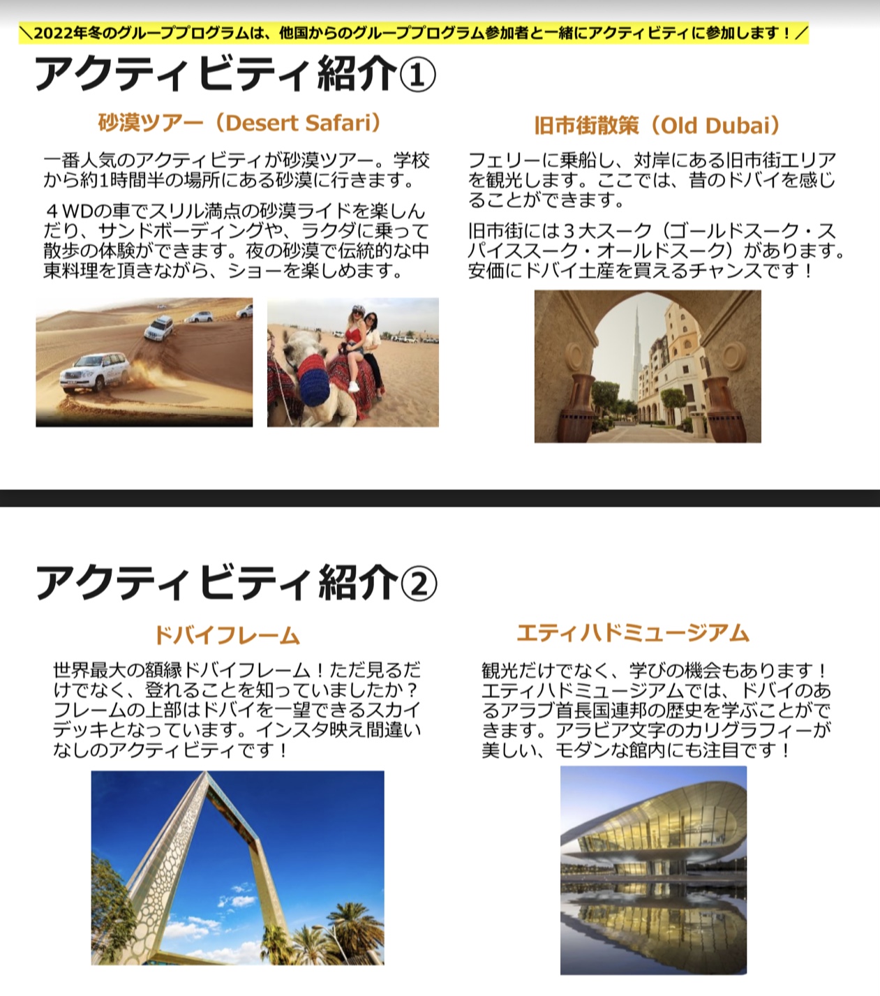 ● 英語コース、滞在先、1日3食の食事、往復空港送迎、ドバイならではのアクティビティ、専用バスでの移動、ツアーガイドがパッケージになったプラン!