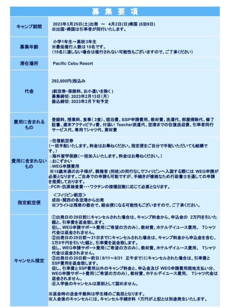◆2023年春休み ジュニアキャンプ in フィリピン、セブ島◆