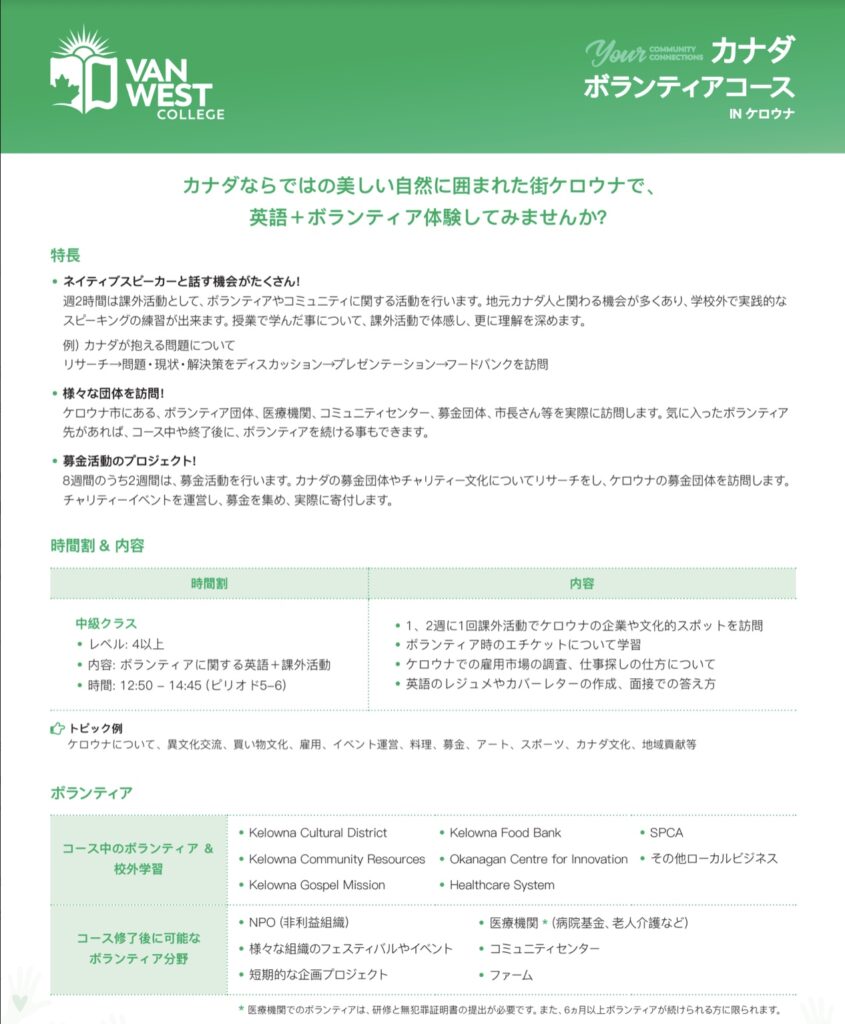 ケロウナ市にある、ボランティア団体、医療機関、コミュニティセンター、募金団体、市長さん等を実際に訪問します。気に入ったボランティア