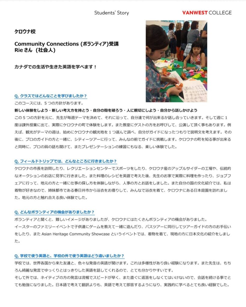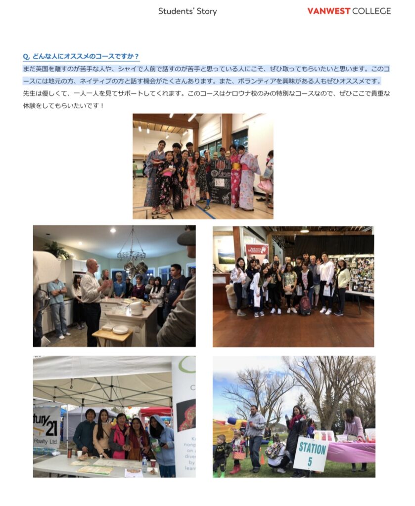 ケロウナについて、異文化交流、買い物文化、雇用、イベント運営、料理、募金、アート、スポーツ、カナダ文化、地域貢献等