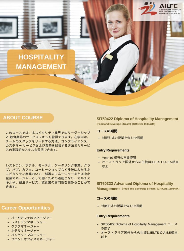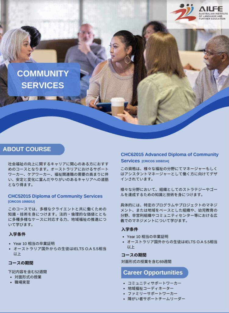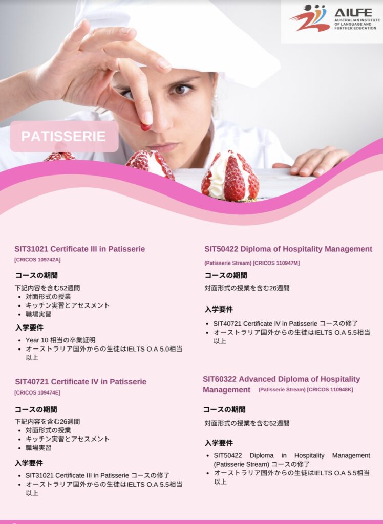 専門コースでは移住を見据えた学生も多く、チャイルドケア(オーストラリアの保育士資格)、クッカリー、ホスピタリティー、各種ビジネスコースなどを開講しています。