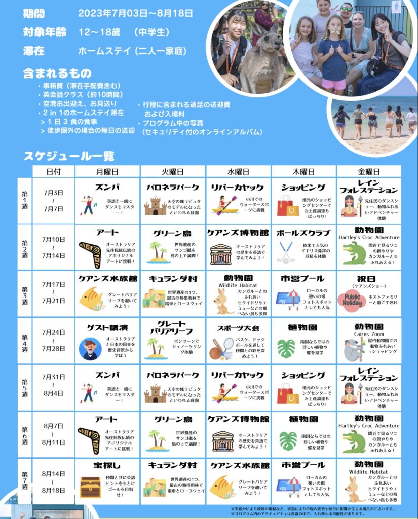 2023オーストラリア、ケアンズ夏休みホリデージュニアプログラム