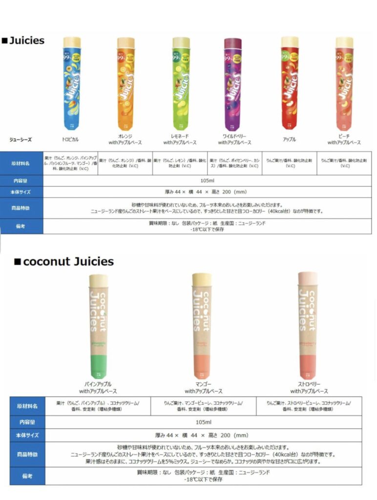 ポイント③ カロリーはうれしい1本40kcal台 :からだのことを気にされる方にもおすすめです。気になる体重、でもアイスも食べたい方には特におすすめです。『Juicies』はトロピカル、オレンジwithアップルベース、レモネードwithアップルベース、ワイルドベリーwithアプルベースの4商品と、2018年から仲間入りしたココナッツクリームが入ったマイルドな風味のココナッツパインアップルwithアップルベース、ココナッツマンゴーwithアップルベースもすべて嬉しい40kcal台です。