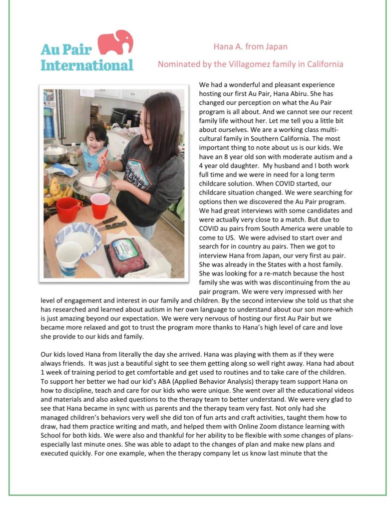 2019年8月に渡米されたHanaさんが Au Pair of the Yearにノミネートされました!