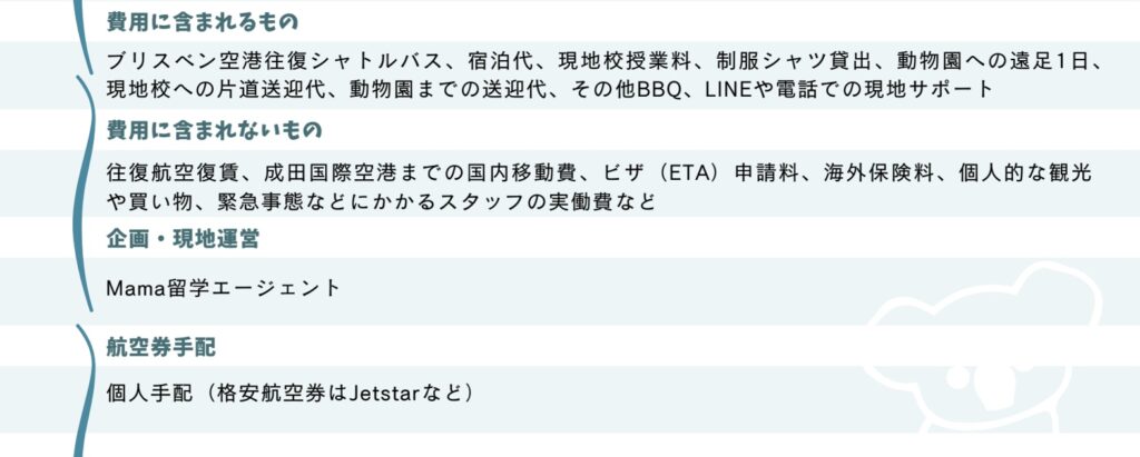 現地校授業料、宿泊費、空港送迎、各種イベント費用、手配料