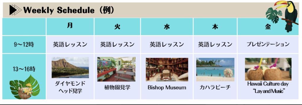 週ごとのハワイにちなんだテーマに沿って、午前中はネイティブ教員による少人数制の英語レッスン、午後はハワイを満喫できる日替わりアクティビティを行っています。