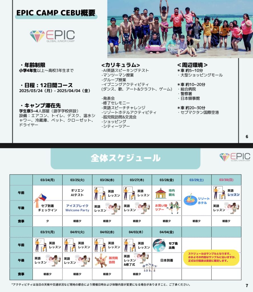 2025年春フィリピン小中高生対象セブキャンプ/日本人引率付