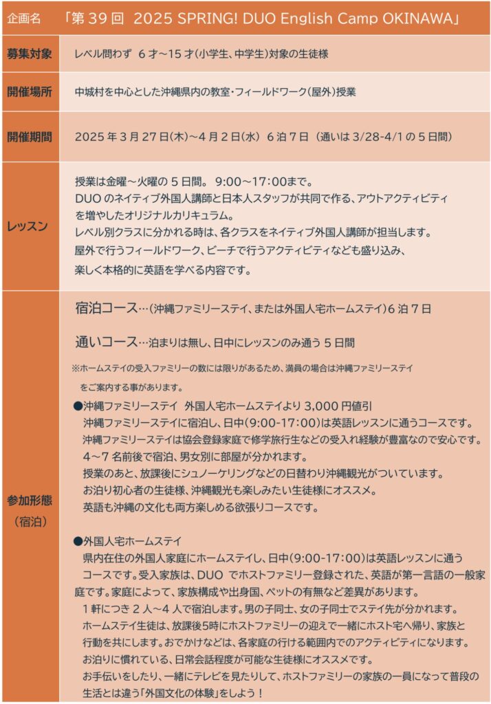 「2025年春休みEnglish Camp 沖縄」と記載の上お問い合わせ下さい。