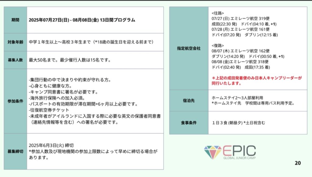 「2025年夏アイルランドジュニアキャンプ 引率付」と記載の上お問い合わせください。