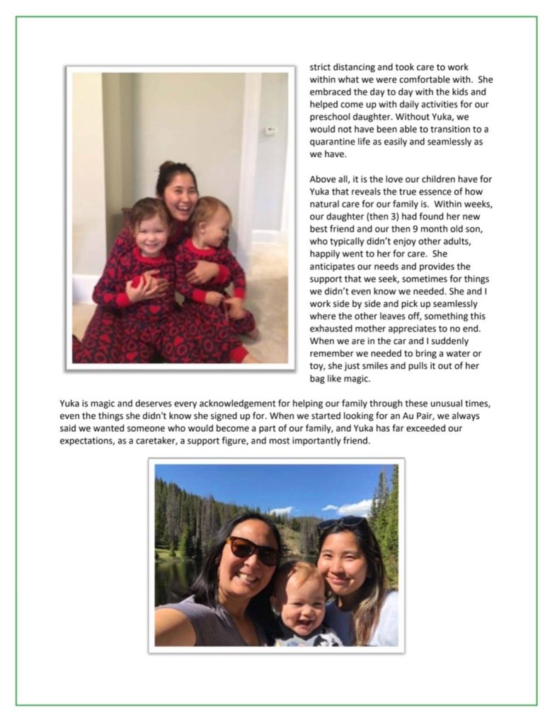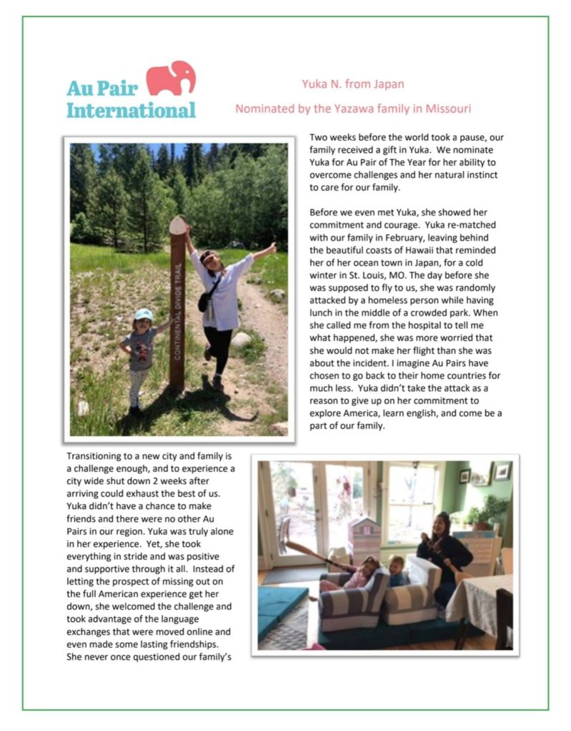 2021-04-02 / 最終更新日時 : 2021-04-02 wapj お知らせ 2019年9月に渡米されたYukaさんが Au Pair of the Yearにノミネートされました! 2019年9月に渡米されたYukaさんが Au Pair of the Yearにノミネートされました!! FacebookXBlueskyHatenaCopy