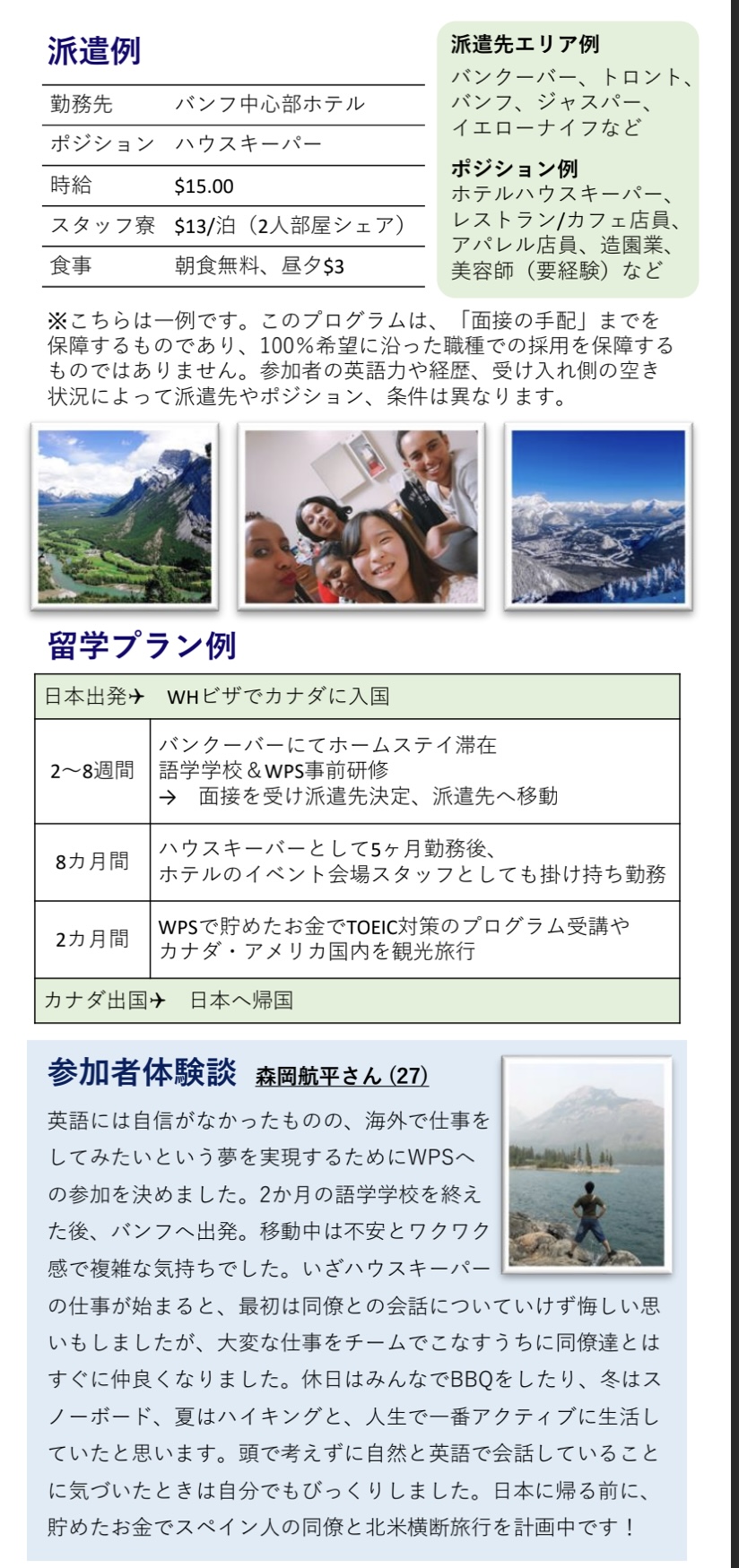 カナダに渡航後すぐに、または語学学校終了後にリゾート地のホテルや都市部の飲食店、アパレルなどで有給のお仕事に就けるワーキングホリデービザ保持者対象のプログラムです。