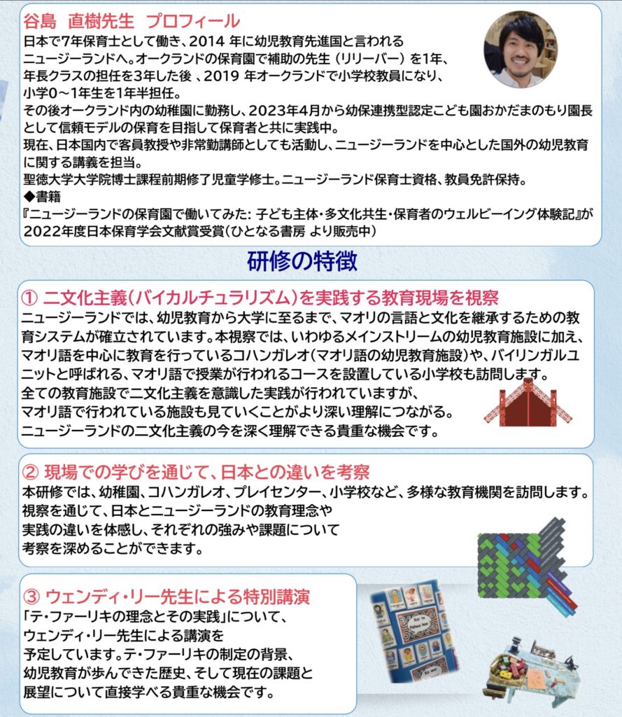 ニュージーランドには、“テ・ファーリキ”と呼ばれる世界でも有名な幼児教育のナショナルカリキュラムがあります。これは、世界で初めて二文化主義(バイカルチュラリズム)の理念のもとに作られ、マオリ文化とイギリス系移民がもつ文化の双方を尊重する教育方針が特徴です。本視察研修では、札幌にある清明学園幼保連携型こども園おかだまのもり園長・谷島直劇先生が同行し、現地での解説や講義を行います。さらに、ニュージーランドの幼児教育の先駆者であるウェンディ・リー先生による特別講演も予定されており、テ・ファーリキの制定の歴史やその後の発展、そして、ラーニングストーリーについて深く学ぶことができます。