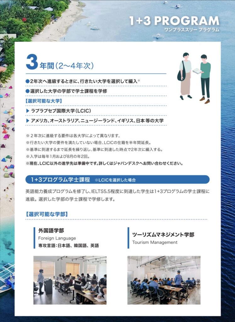 「1+3プログラム」では、英語に自信はないけれど海外の大学で学びたい方、海外で異文化に触れたい方に向けた教育を行います。