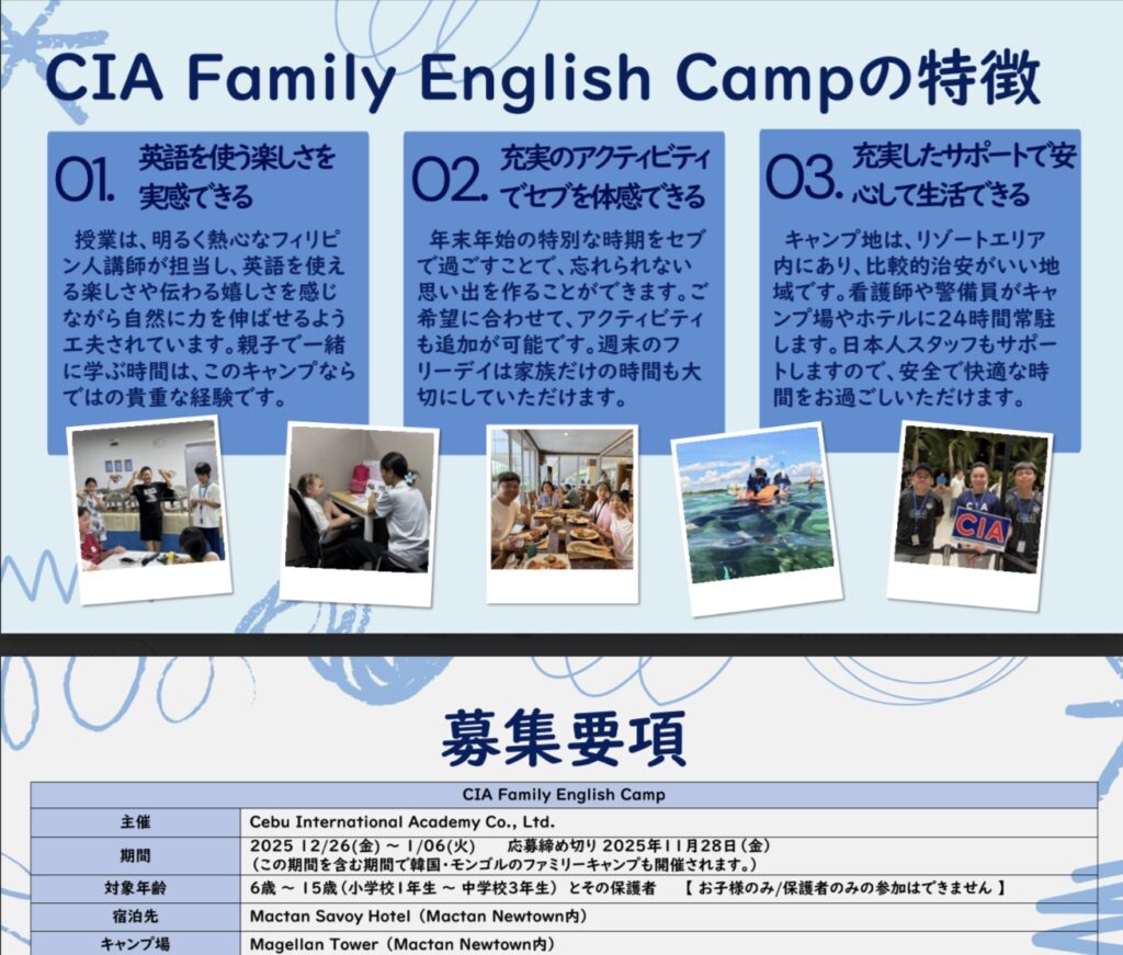 「2025冬休み親子留学!フィリピンセブ島Family English Camp」と記載の上お問い合わせ下さい。