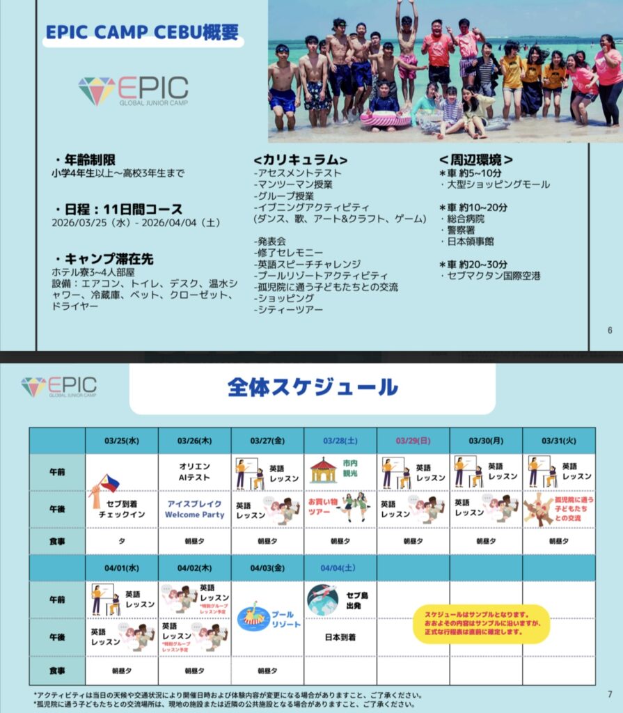 2026年春・小中高生対象フィリピン、セブキャンプ 11日間プログラム