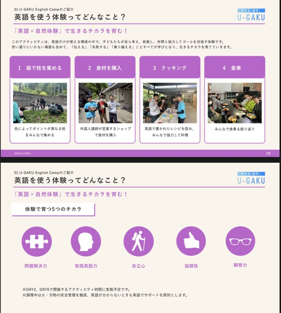 英語レシピを読み解き、チームで相談しながら調理を進めるプロセスでは、うまくいかないこともあります。でも、それを「失敗」ではなく「学び」に変えるのがこのキャンプの特徴です。知識よりも、実践。正解よりも、挑戦。「うまくいかなかったけど、自分で工夫した」経験が、未来の自信につながります。