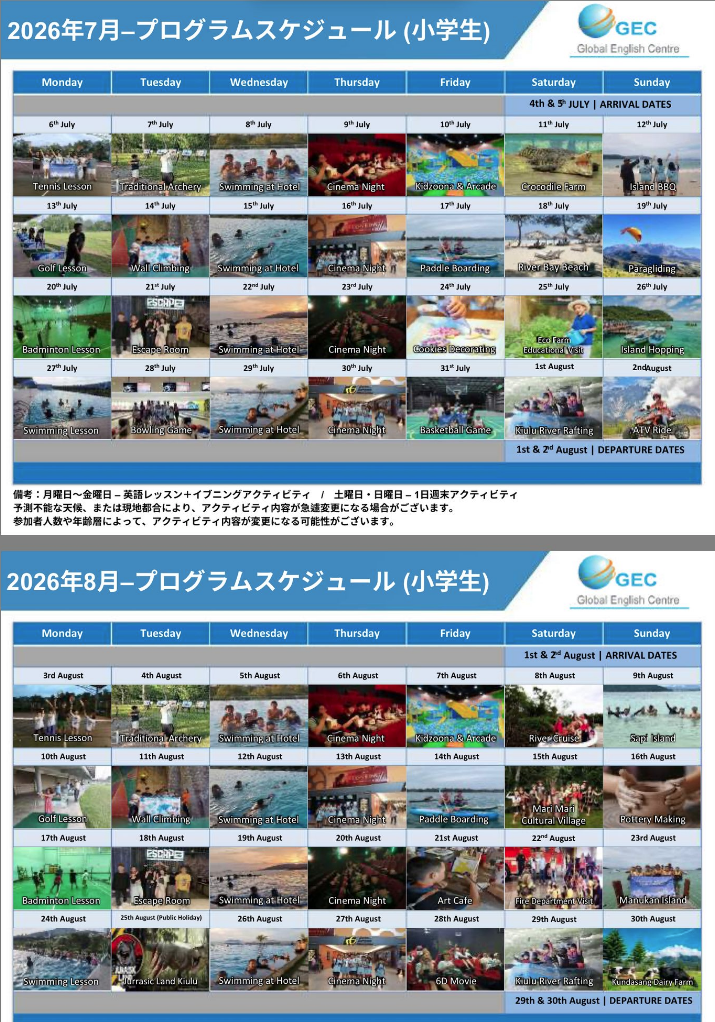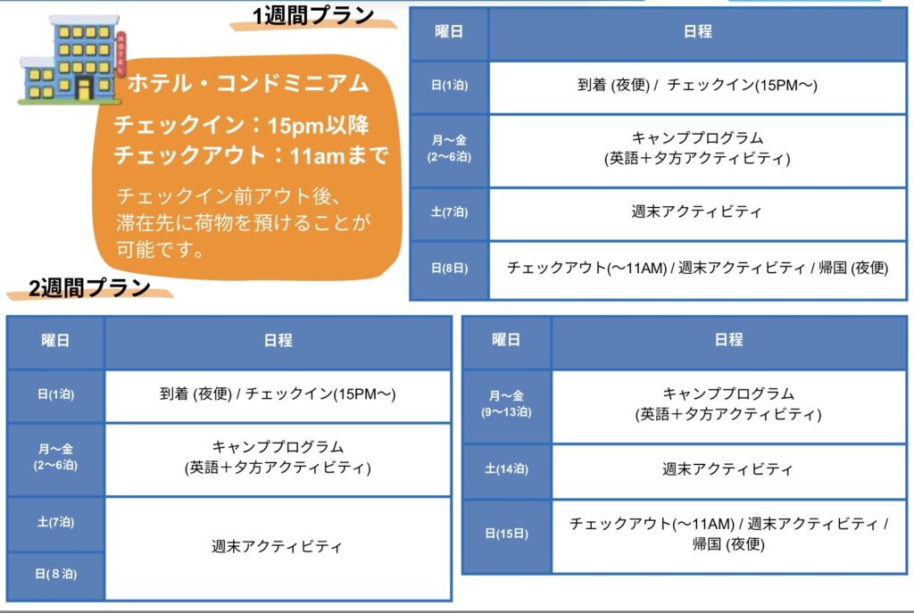 土/日曜日:到着月曜日〜金曜日:キャンププログラム土/日曜日:帰国平日英語授業平日夕方アクティビティ週末終日アクティビティ