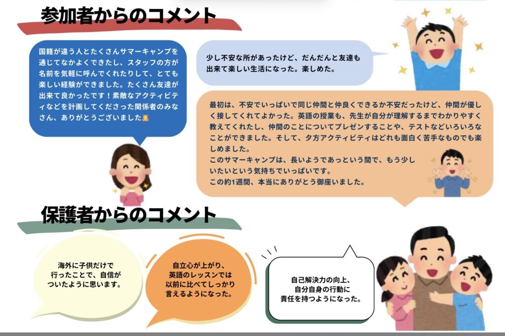キャンプ参加者用にチャーターされた、バスの座席数に制限があるため、保護者は週末のアクティビティにのみ参加できます。参加希望の有無は、キャンプお申込時にご確定ください。