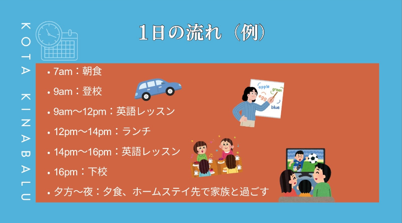 含まれる内容:登録料、英語コース、テキスト、滞在費、空港往復送迎、平日朝夕食、週末3食、海外送金手数料
