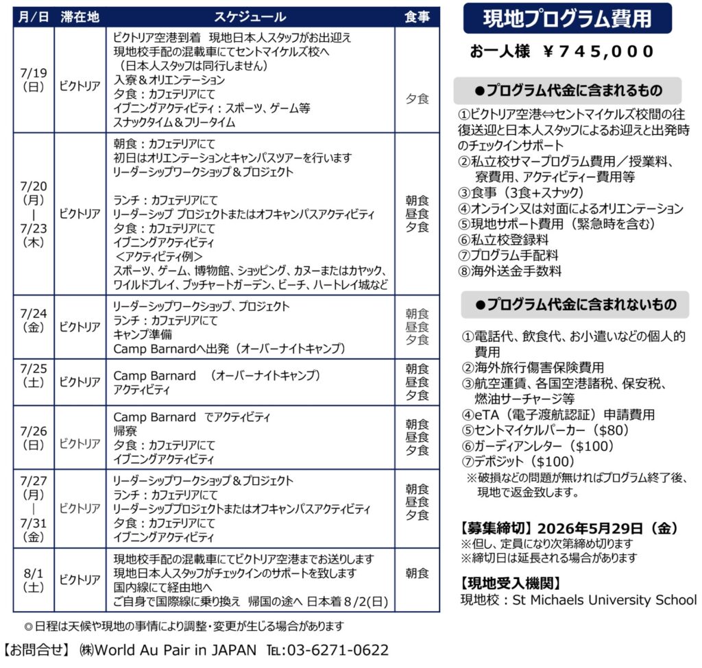 ビクトリア空港⇔セントマイケルズ校間の往復送迎と日本人スタッフによるお迎えと出発時のチェックインサポート、私立校サマープログラム費用/授業料、寮費用、アクティビティー費用等、食事(3食+スナック)、オンライン又は対面によるオリエンテーション、現地サポート費用(緊急時を含む)、私立校登録料、プログラム手配料、海外送金手数料