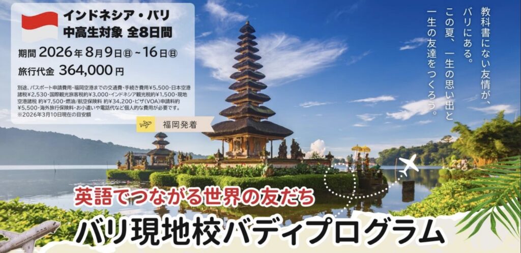 引率付!2026年夏・中高生インドネシア、バリ島現地校バディプログラム(航空券付)