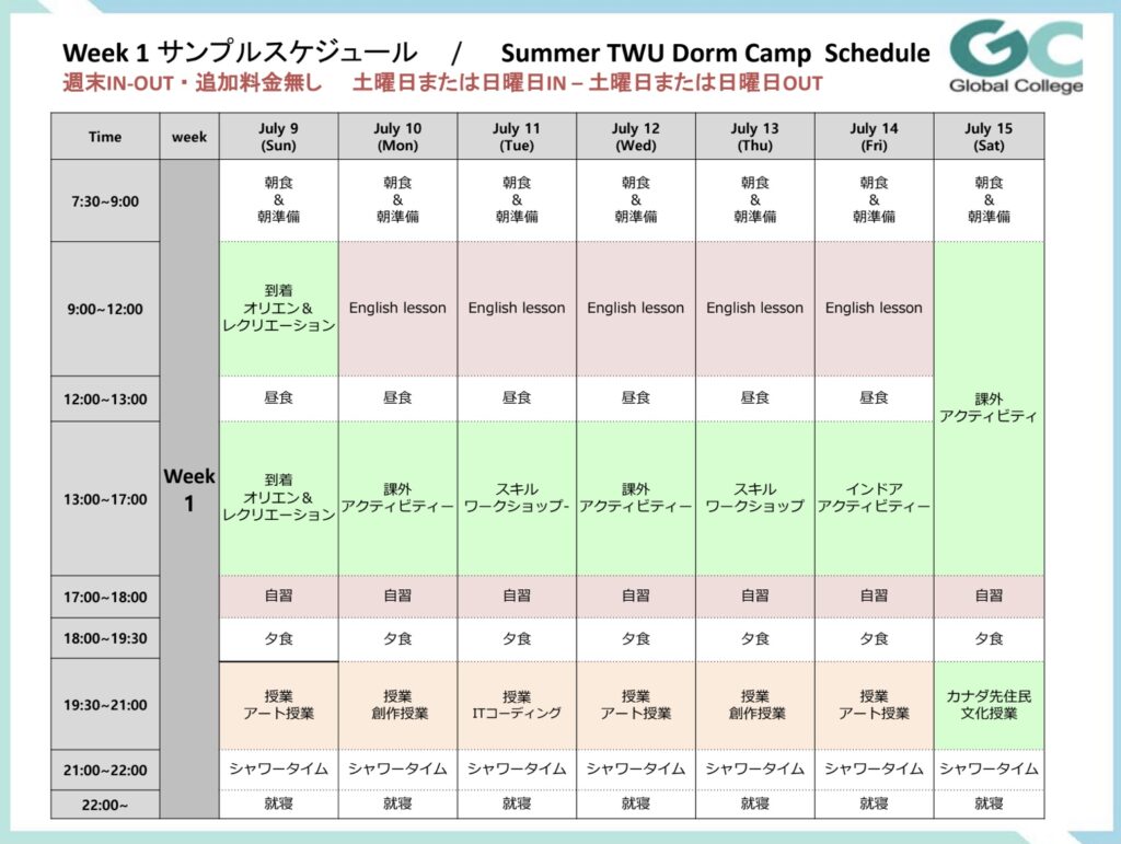 ①2週間TWU大学寮サマーキャンプ+1週間Global CollegeキャンパスEnglish for Young Leaners組み合わせにてお申し込み→大学寮滞在もホームステイも両方体験可能!(両方申し込みの場合は入学金無料)
